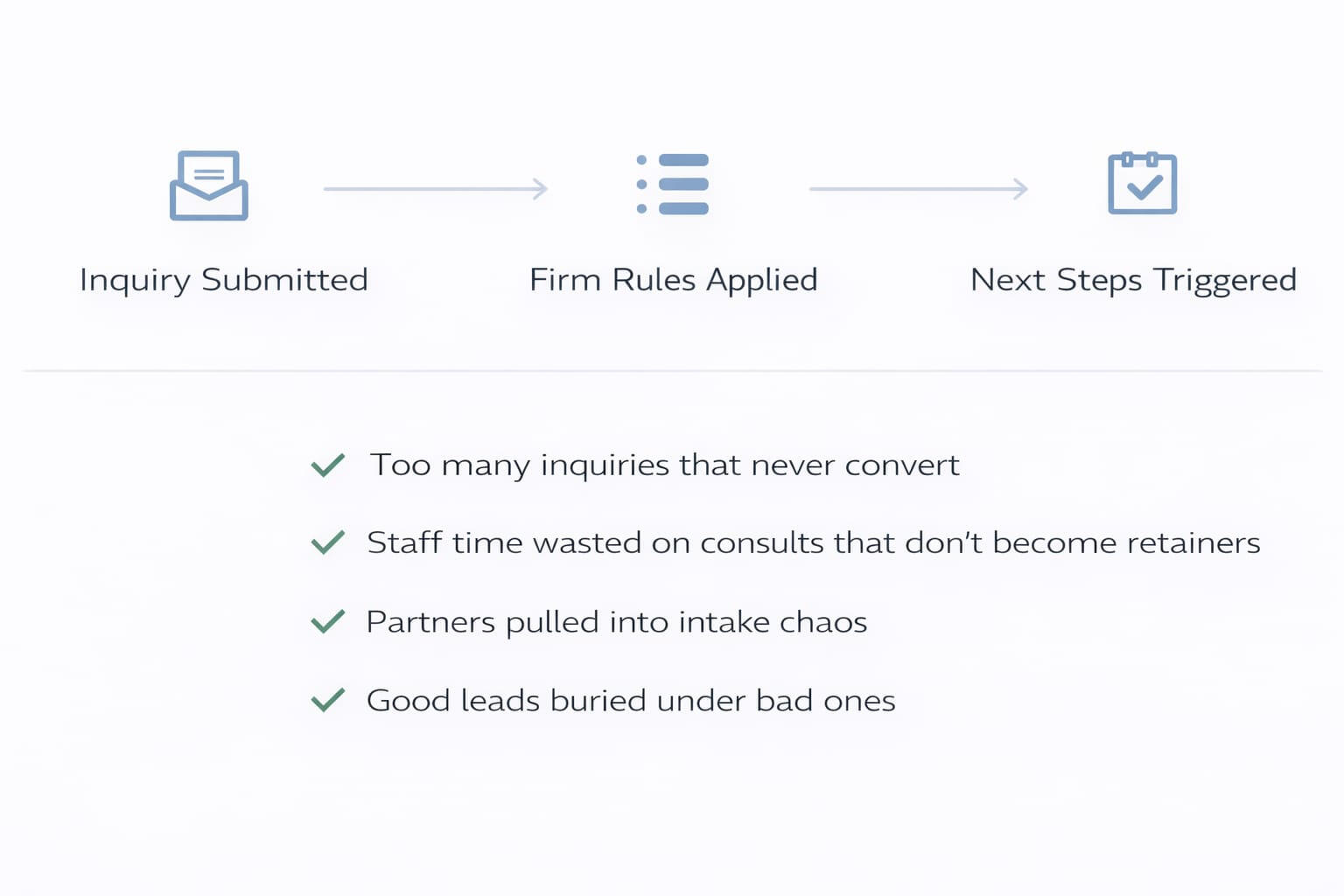 First Screen replaces your contact form with a structured intake that qualifies, routes, or declines inquiries based on your firm’s rules, before staff or partners get involved.