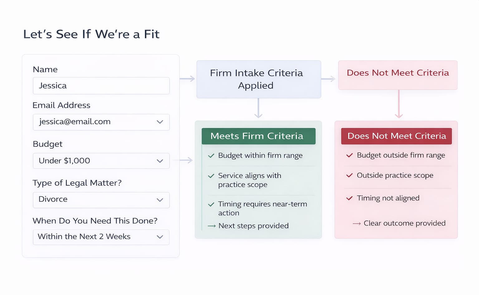 First Screen replaces your contact form with a structured intake that qualifies, routes, or declines inquiries based on your firm’s rules, before staff or partners get involved.